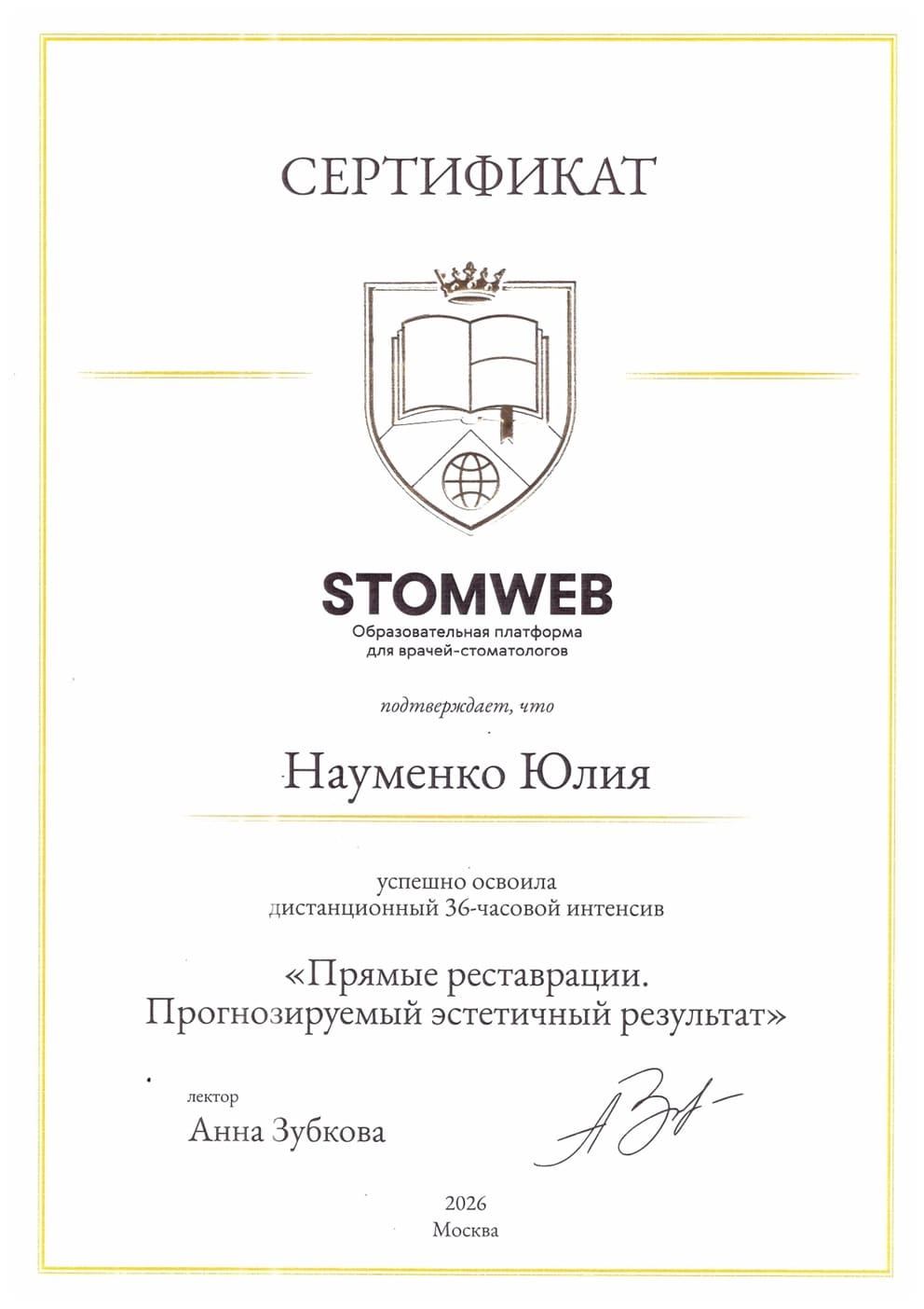 - 2026 г. Успешно освоила дистанционный 36-часовой интенсив «Прямые реставрации. Прогнозируемый эстетичный результат»