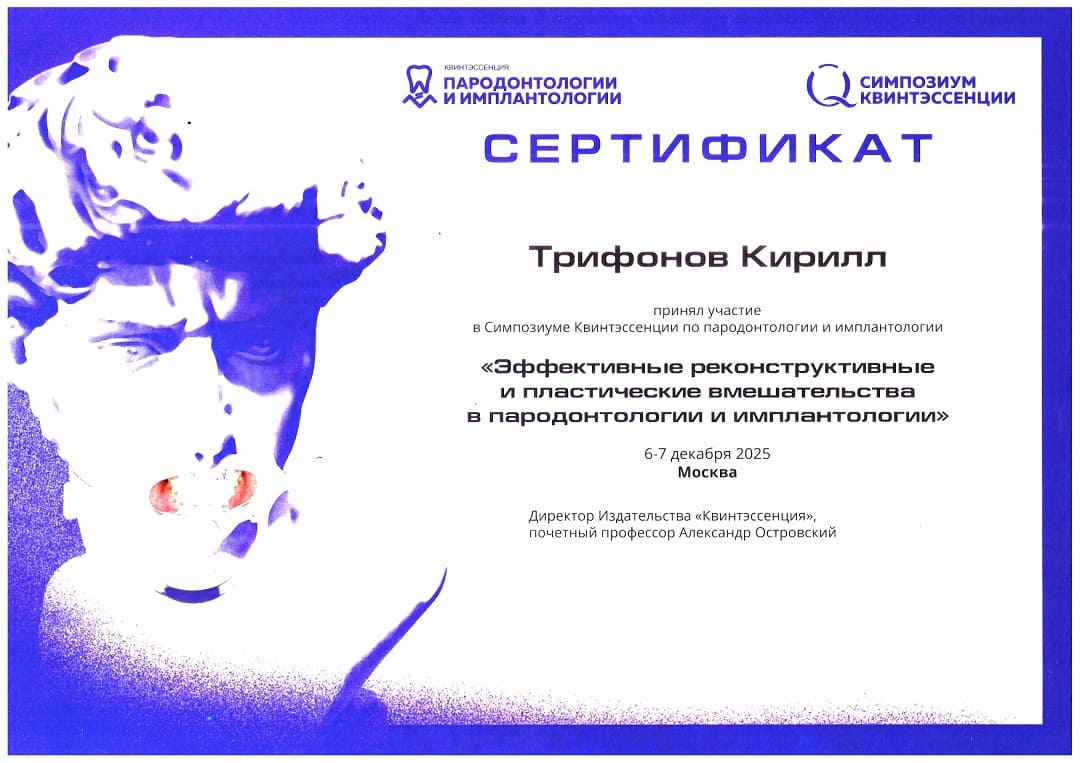 - 6-7 декабря 2025 г. - принял участи в Симпозиуме Квинтэссенции по пародонтологии и имплантологии «Эффективные реконструктивные и пластические вмешательства в пародонтологии и имплантологии», г. Москва